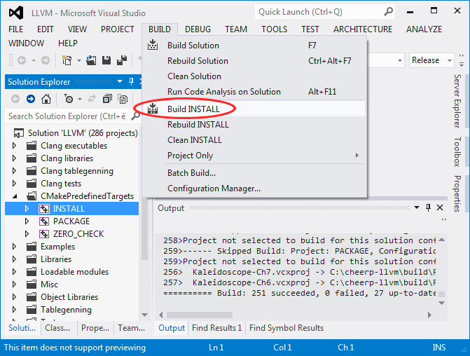 When the build is finished, select the INSTALL project in the CMakePredefinedTargets group and build it.